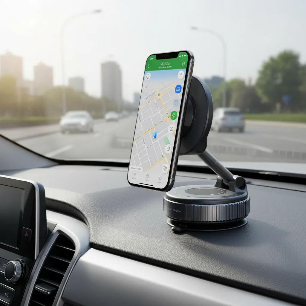 Soporte compacto para celular con rotación completa ideal para autos o escritorios.